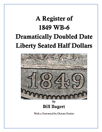 Bugert, Bill, A Register of 1849 WB-6 Dramatically Doubled Date Liberty Seated Half Dollars, Gettysburg, PA: Self-published, May 2025. This is a new previously unpublished reference which details all examples of the 1849 Dramatically Doubled Date half dollar known to me. This reference features an image of each coin, key identification characteristics, grade, and third-party identification (if any), known pedigree information, and any miscellaneous notes pertaining to each coin.